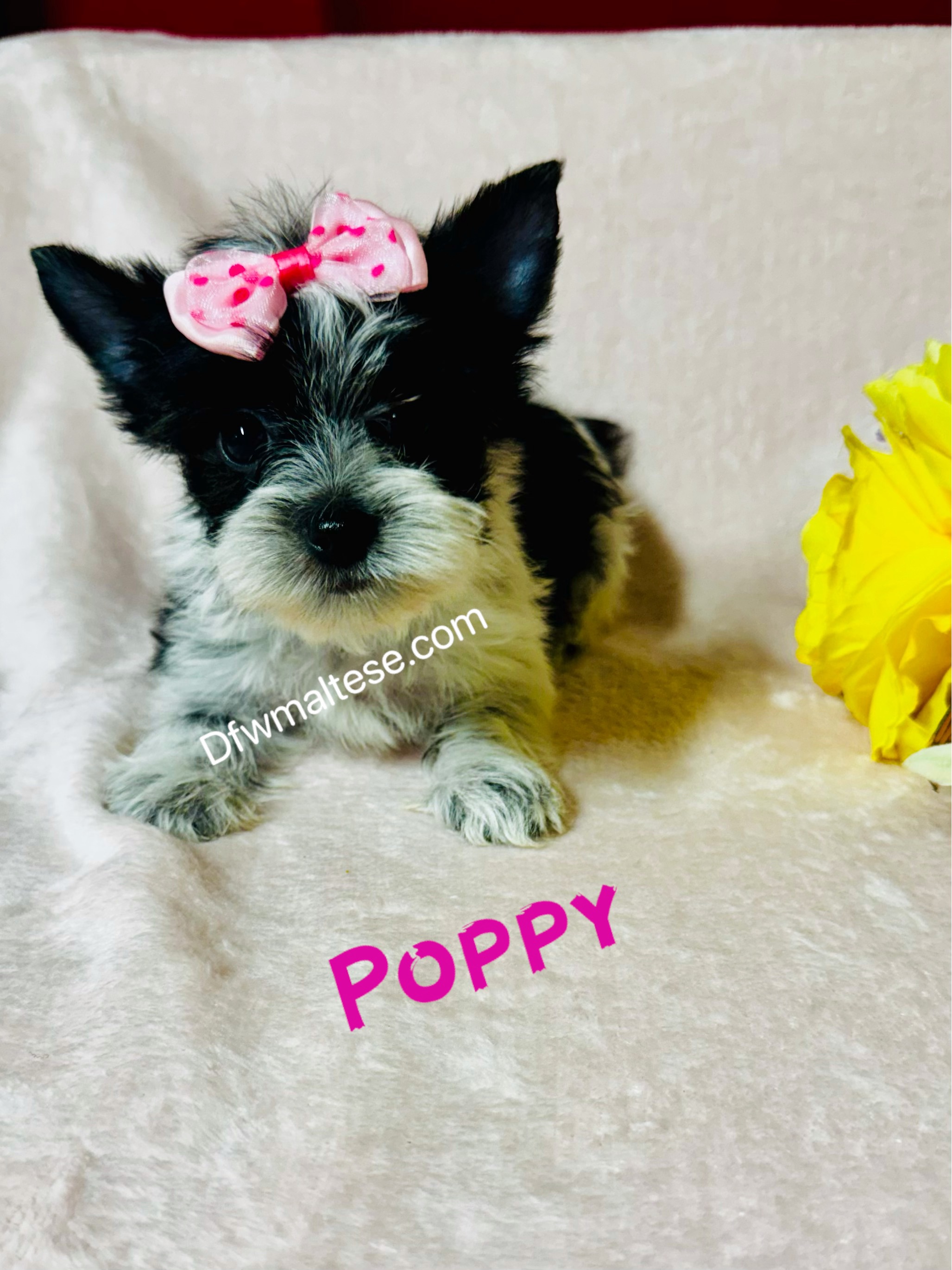Poppy Parti Yorkie female Black and White. Born 2/23/2026, ACA registered and Charting to be around 6lbs grown. She comes current on vaccines appropriate for her age, dewormed, and microchipped. Ready to go 4/25/2026